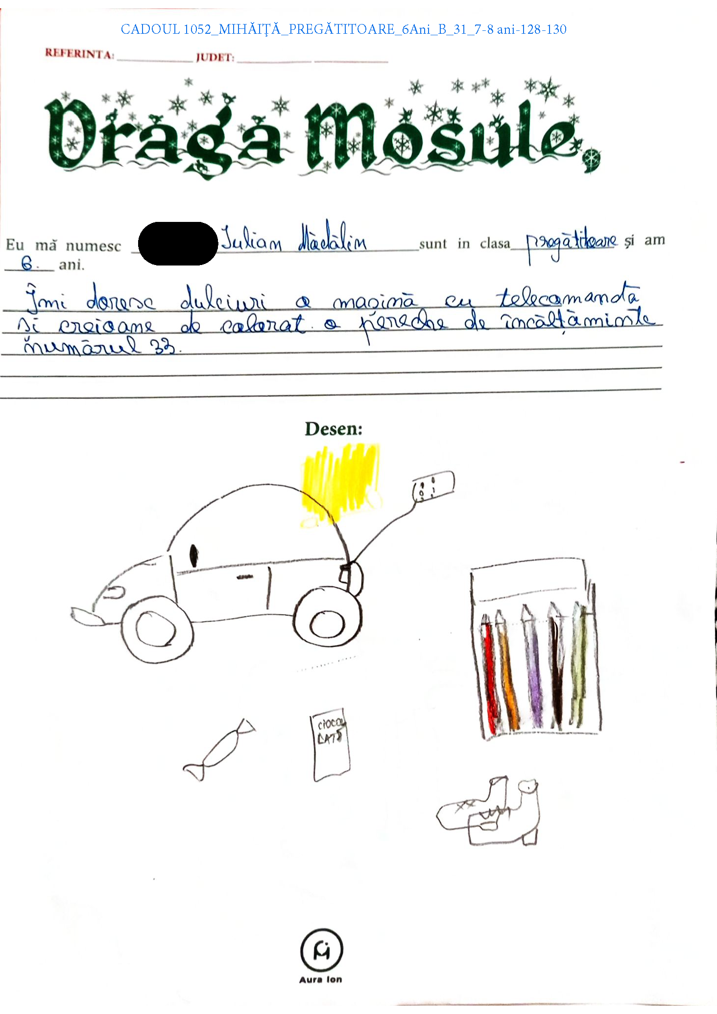 | Dorinte | Masina cu telecomanda, creioane de colorat, Familie formată din 4 copii și părinții lor fără ocupație. Singurul venit este alocația copiilor și ajutorul socialdulciuri |